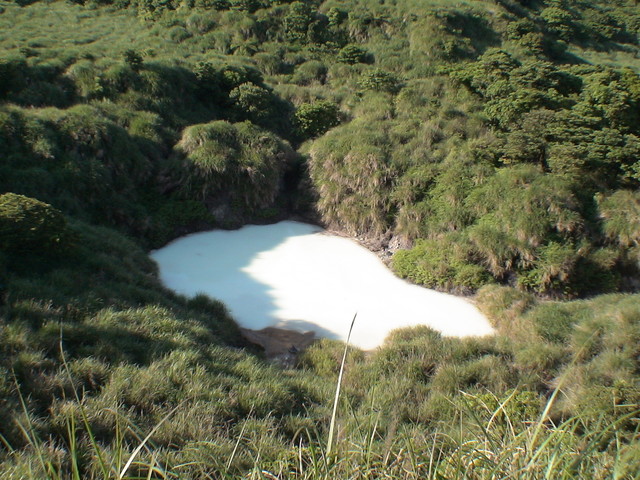 溫泉池裡滿滿乳白色的白磺泉 充滿生命力的從源頭奔流進池子裡