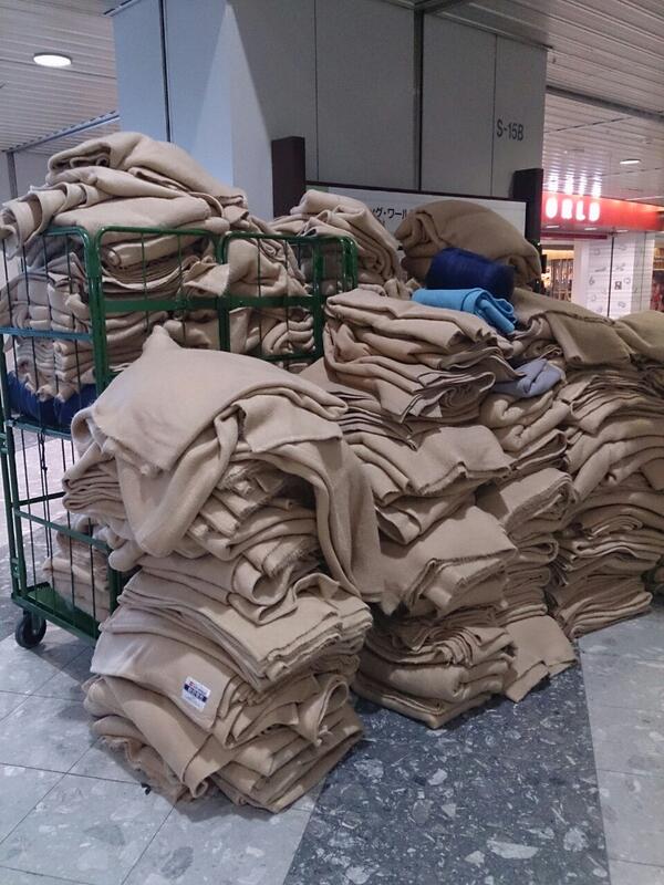 機場早已準備好非常充分的避難毛毯跟睡袋 每個人都有 應變很充足(下圖)